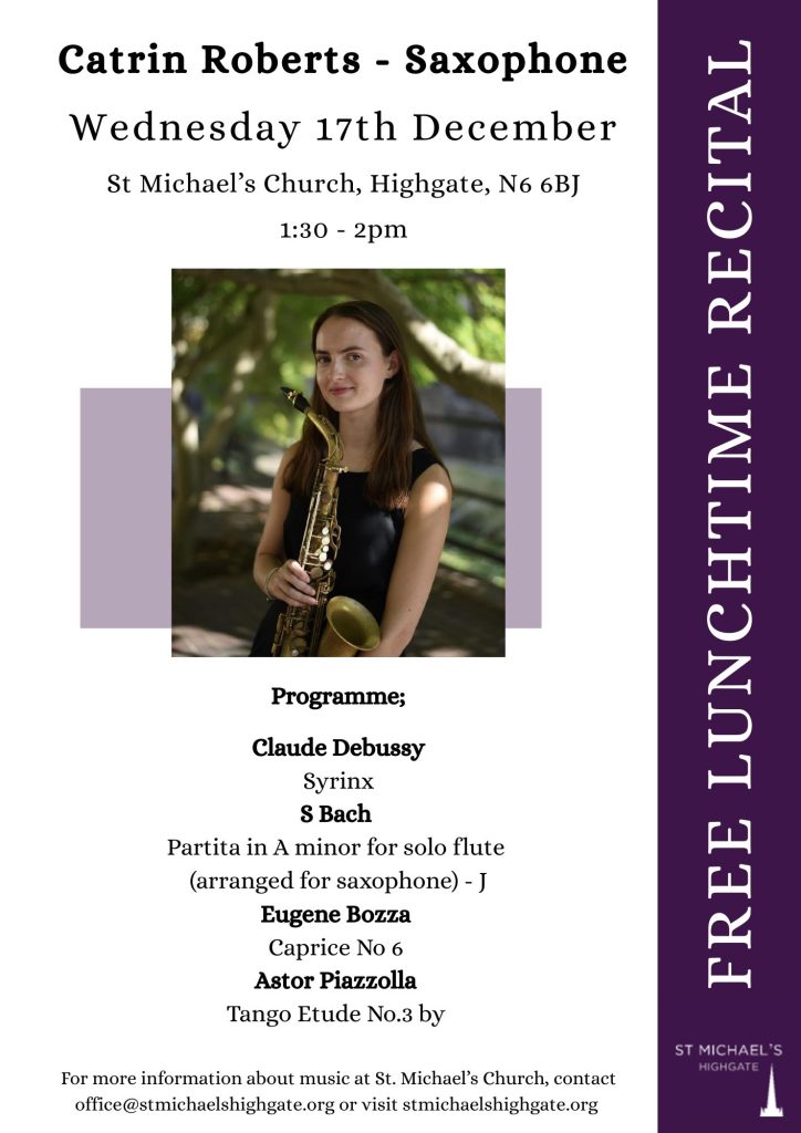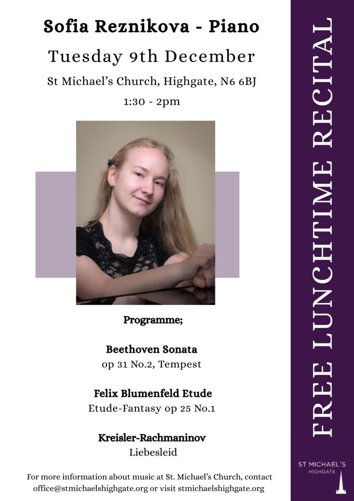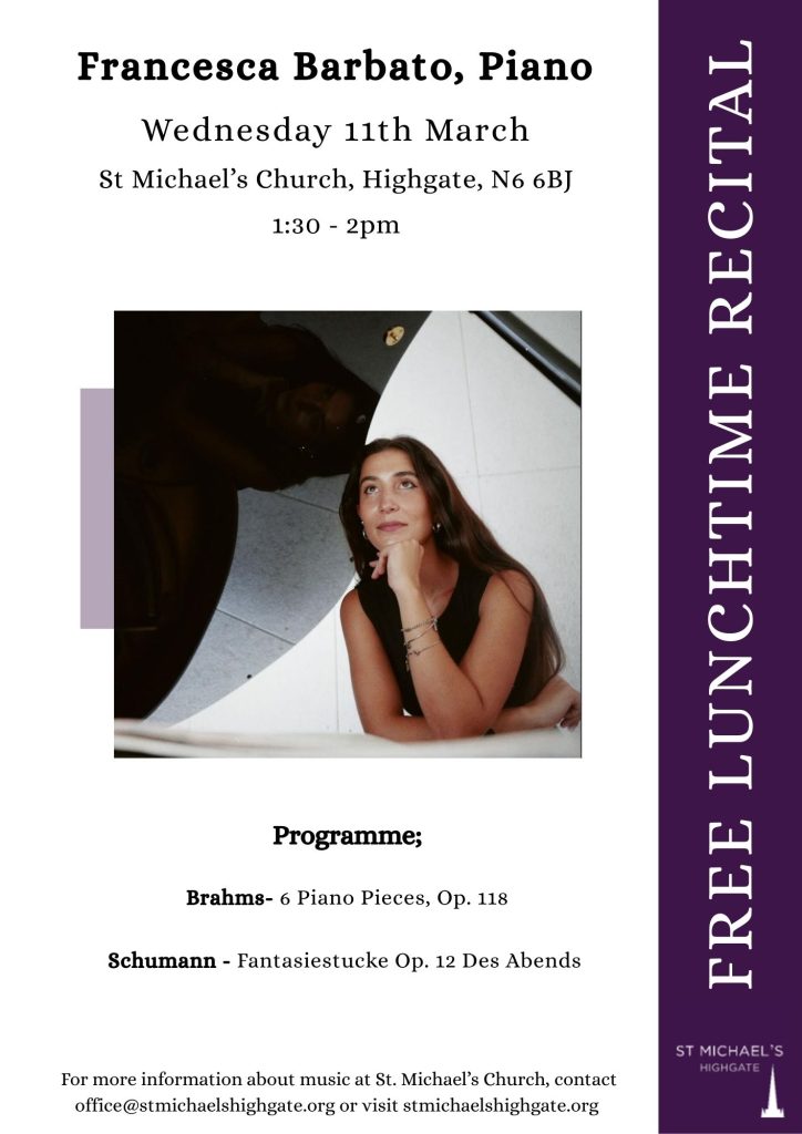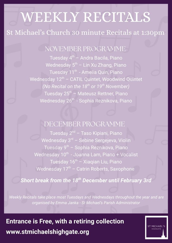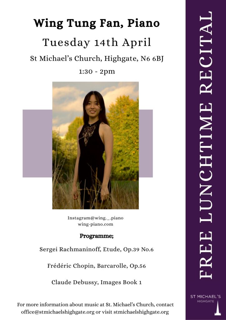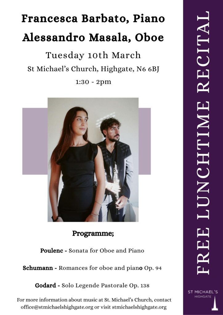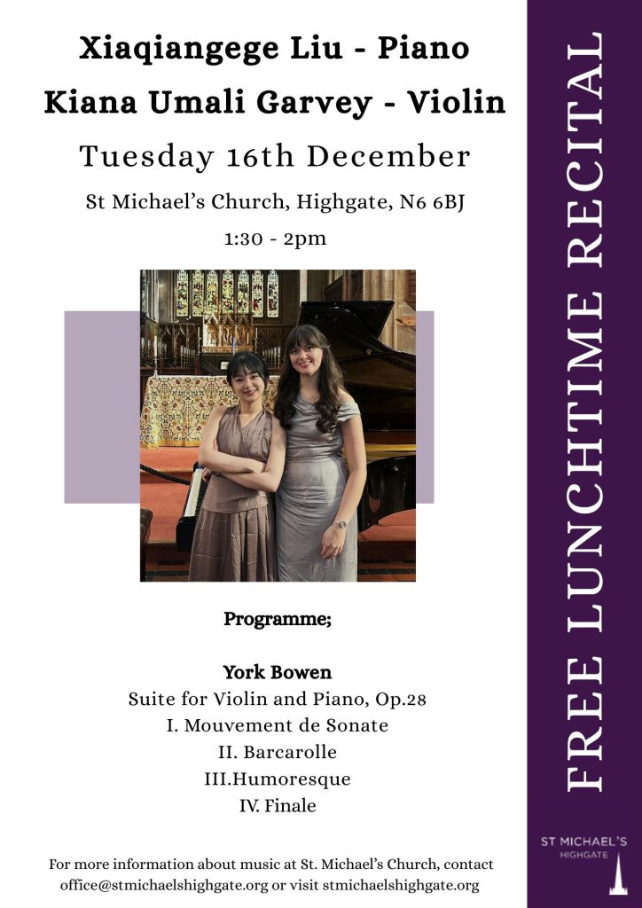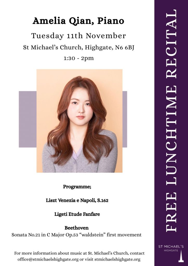 We host Free music recitals at St Michael’s Church. Musicians are given the opportunity to perform in front of an audience again and the audience receives a much needed dose of musical wellbeing. This season our Lunchtime recitals are performed mostly by students or alumni of The Royal College of Music, The Royal Academy of Music as well as other leading Music colleges, and independent musicians. The concerts start at 1.30pm and last for 30 minutes. Entry is free with a retiring collection.