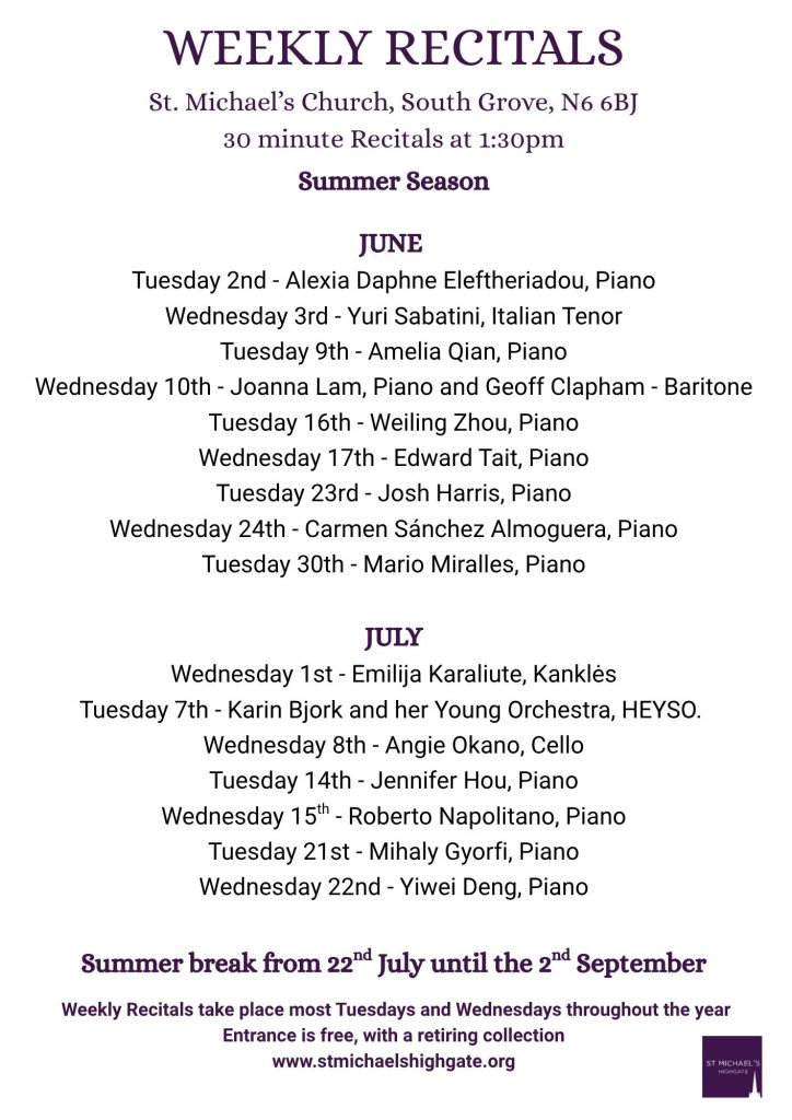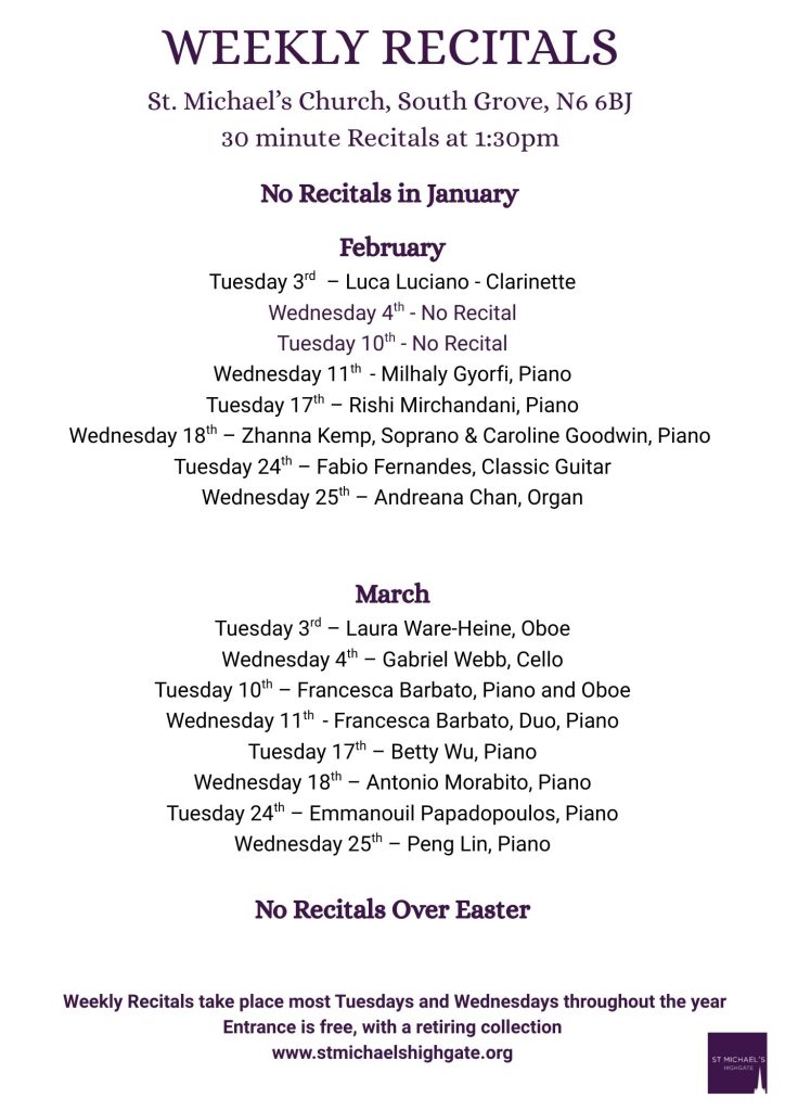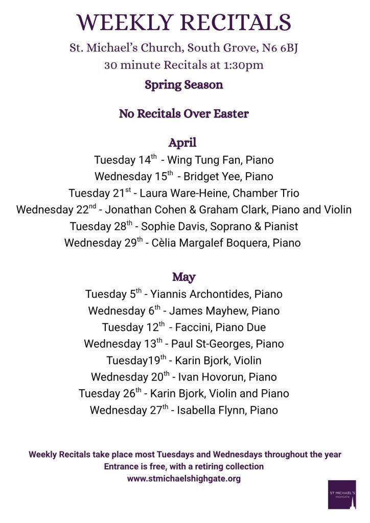 Recitals will start back on the 14th April and next week (WC 7th April) we will share the recital programmes.